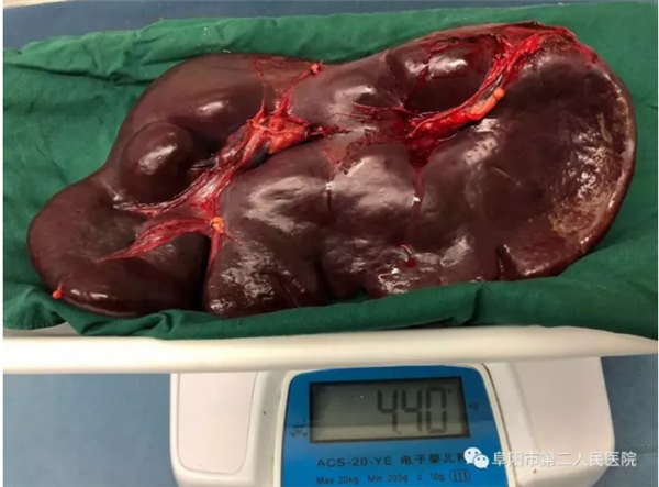 8月20日,在阜阳市二院肝胆外科的努力下,成功将赵某某体内体积达40厘米×26.5厘米×11厘米、重达4.4公斤,堪比“巨大胎儿”的巨脾切除。