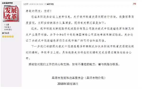 这位网友的问题,很多阜阳人都非常关心,对此,市发改委回复,将按照内嵌式中低速磁悬浮车辆制式加快阜阳城市轨道交通建设规划的编制。