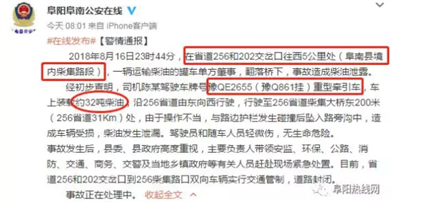 8月17日早上,阜阳阜南公安在线微博发布警情通报:2018年8月16日23时44分,在省道256和202交岔口往西5公里处(阜南县境内柴集路段),一辆运输柴油的罐车单方肇事,翻落桥下,事故造成柴油泄露